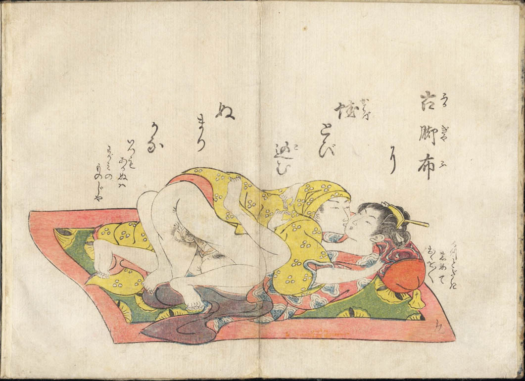 A very rare orihon album with a plate of introduction and 12 plates of erotic scenes. The style is typical of an artist from the Kamigata area and the quality of printing and coloring reminds of the kappazuri-e of Osaka.