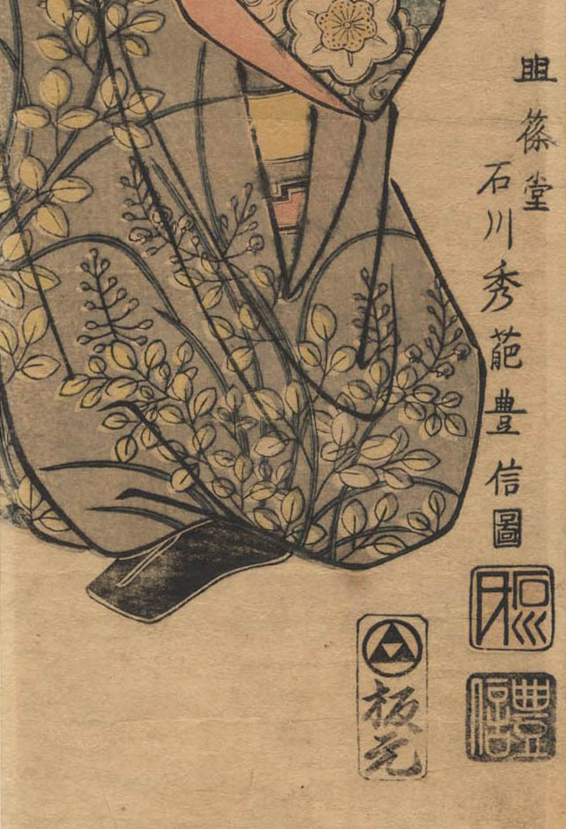 Another impresssion is illustrated in colour in Yamaguchi Kenzaburo, Genshoku ukiyoe daihyakka jiten. Vol. 6, Sakuhin ichi: Moronobu-Harunobu. Tōkyō,1982, no. 171 and in b/w in Jacob Pins, The Pillar Prints. Hashira-e. London 1982, n. 75.