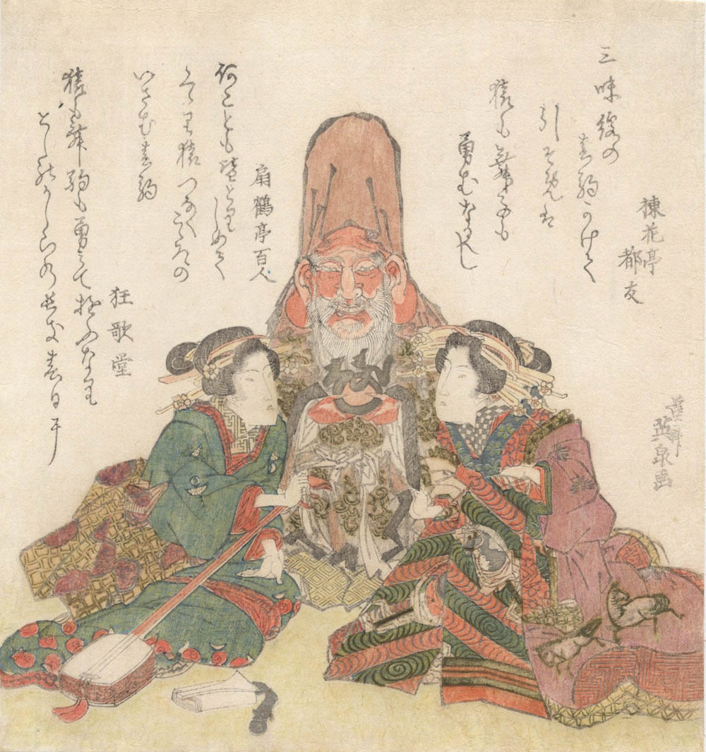 Two courtesans and Fukurukuju one of the seven Lucky Gods (Shichifukujin) holding the symbol for the Sacred Jewel (Tama).