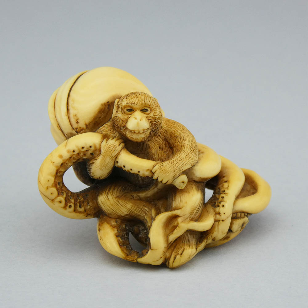 Monkey and octopus Javascript is required to use OS Responsive Image Gallery Ivory netsuke depicting a monkey between the tentacles of an octopus, the head of the mollusk wrapped in a furoshiki.Nice patina.Unsigned 19th century 4.3 x 4 x 2.1 cm NP03