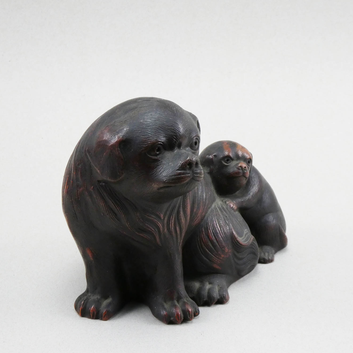 Bizen okimono Javascript is required to use OS Responsive Image Gallery A fine Bizen ware pottery okimono of a bitch with a puppy. Warm brown patina. Wood storage box (tomobako). Unread pressed seal Late 19th century. Height 14 x 17,5 cm. Item no: CR06